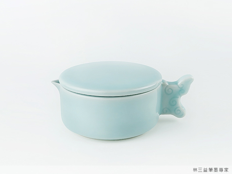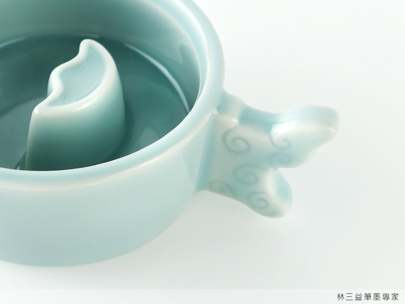 青釉墨池不僅外型別緻,顏色典雅,細節設計也考量了書寫者的使用便利。墨池中央高巧來的島狀設計,可在寫字時順筆,刮除多餘的墨汁。